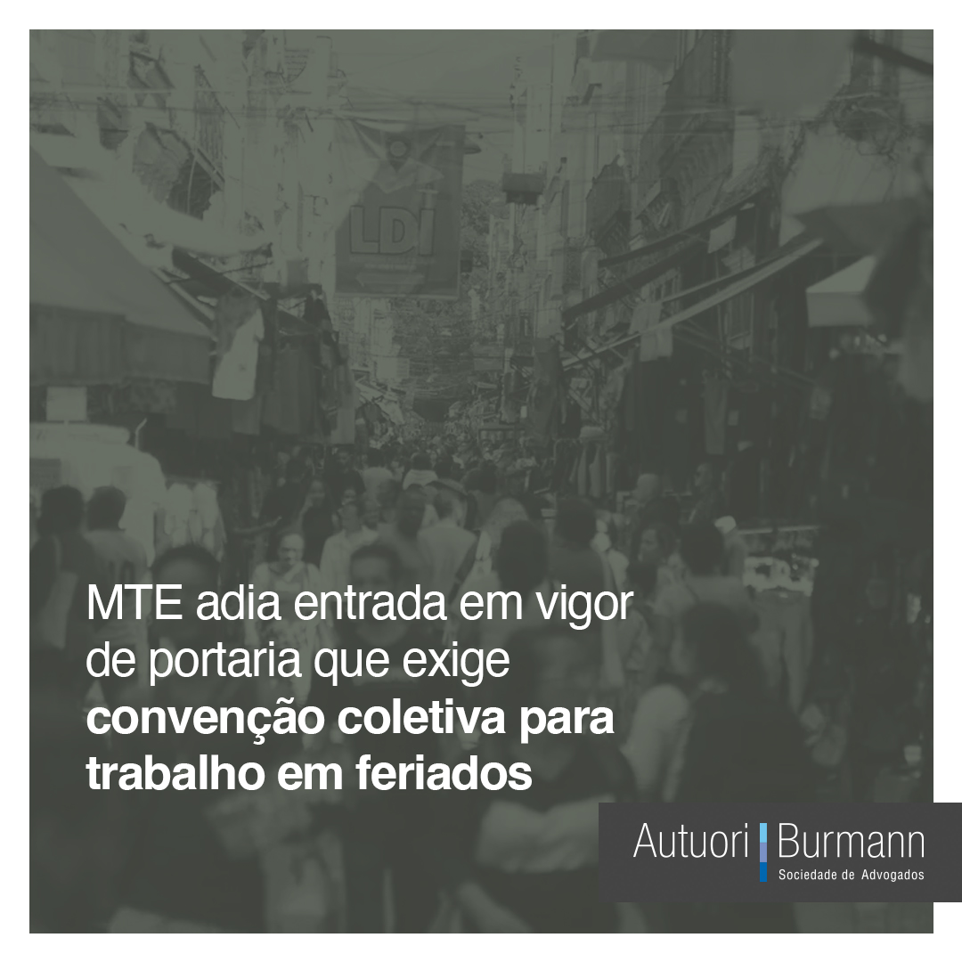 Foi publicada a Portaria MTE nº 3.708, que adia até 1º março de 2024 a entrada em vigor de portaria que exige convenção coletiva de trabalho com sindicatos de trabalhadores para a abertura de lojas em domingos e feriados.